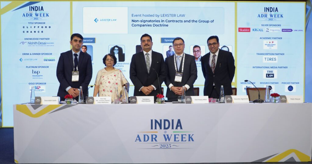 We hosted a panel discussion during India ADR Week 2025 on 18 September 2025 on “Non-Signatories in Contracts and the Group of Companies Doctrine”, featuring Hon’ble Ms. Justice Indu Malhotra (Former Judge, Supreme Court of India), Dr. Sanjeev Gemawat (Managing Director & Group General Counsel, Essar Group), Mr. Ooi Huey Miin (Partner, Rajah Darryl & Loh, Malaysia), and Mr. Saurav Agrawal (Counsel, New Delhi). The session was moderated by Mr Saurabh Seth, Counsel, New Delhi.